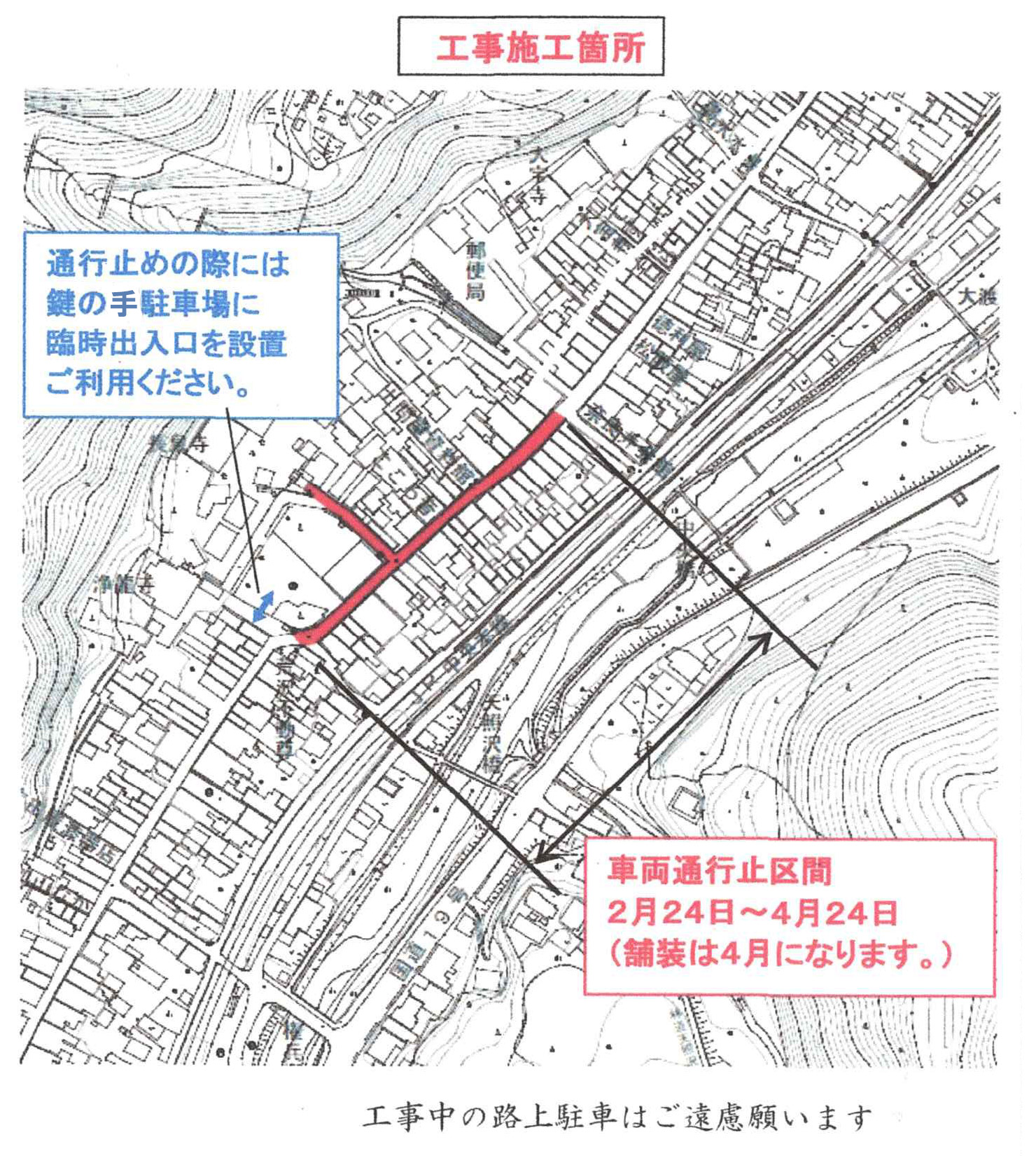 工事期間中の路上駐車はご遠慮ください。